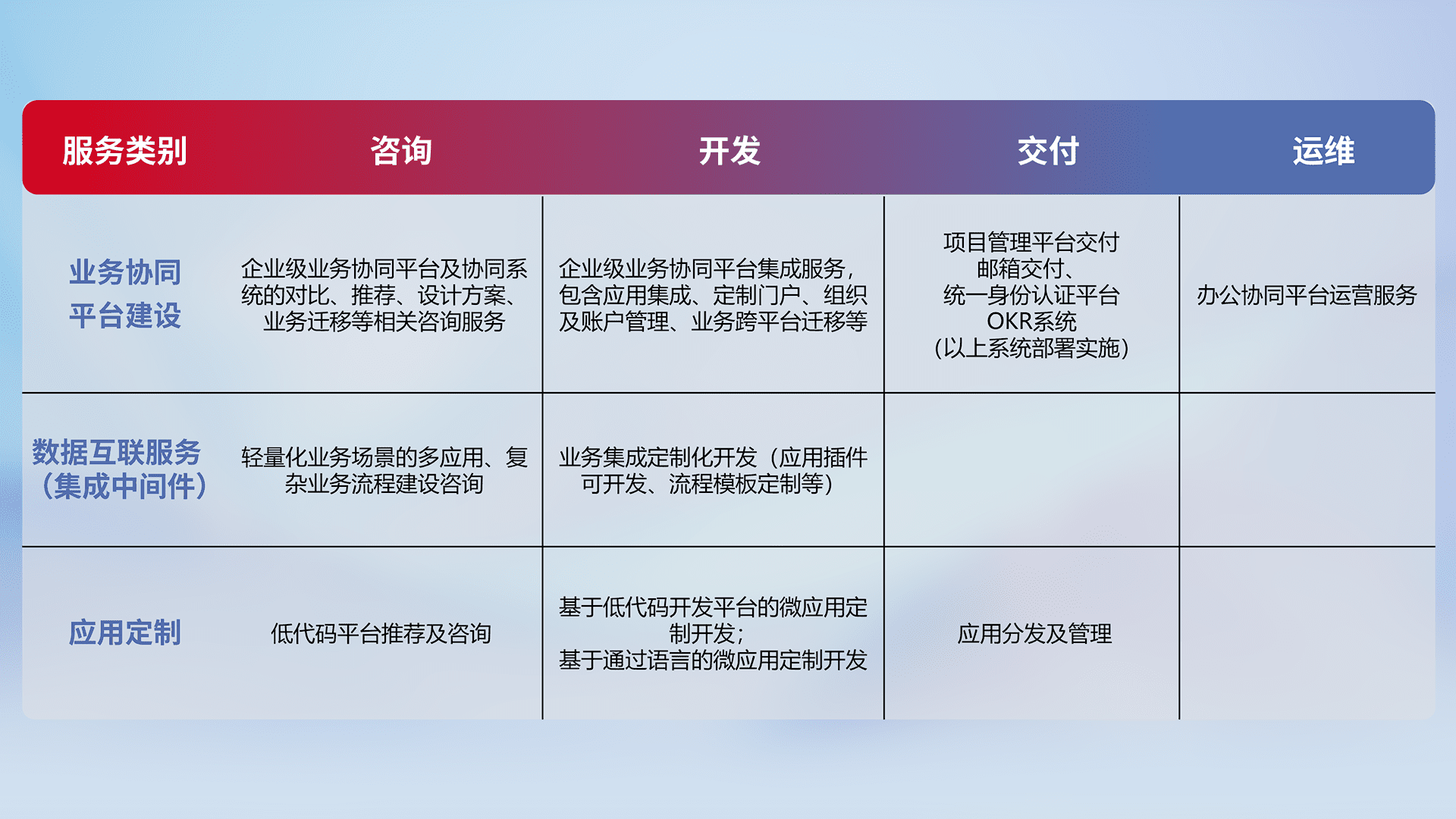 针对钉钉、、企微、、、IDaas等平台级产品提供产品的规划、、、方案、、、、交付、、、定制化开发等服务,,,实现如统一协同办公、、智能客户服务、、、混合会议管理、、、智能数据查询、、、、等业务场景,,,,实现数字化转型。。。